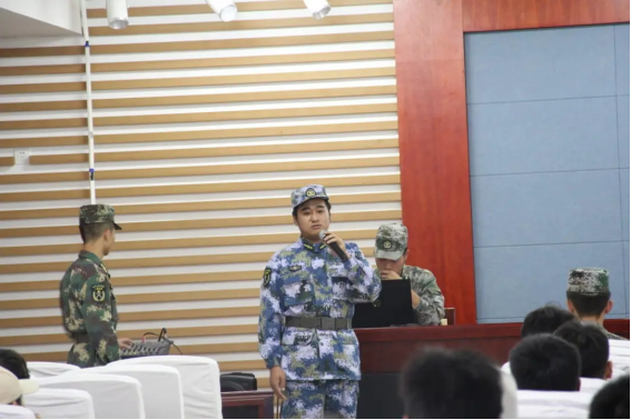 党委学生工作部、武装部副部长王朝举讲话。王朝举副部长首先向同学们报告应征入伍的利好消息以及讲述了国防的重要性,并指出“只有每个中华人民都积极投身国防,我们的长城才能屹立不倒”的观念。利好消息主要有两个方面:第一,从经济方面来说,入伍的同学可以享受到学费补偿和国家助学贷款代偿,还可以享有地方政府的补助和奖励,服役期间还有优待金(各个地方不同),退役后有退役金;第二,从成长账方面来说,主要体现在毕业优待(可免毕业设计、挂科帮扶)、学业优惠、就业优待、政治优待(军人家属医疗免费等)。王副部长告知学校准备组建2022年入伍“预征班”并鼓励大家积极报名。