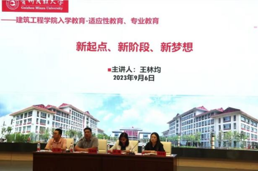 学院何璘书记以《理想信念教育及爱校荣校教育》为题,为同学们讲述学校、建工学院的概况以及人才培养目标—为贵州少数民族地区输送高质量人才,让学生在了解学校的基础上能热爱学校,并用《党的百年》宣传视频激励同学们,用实际行动贯彻落实习近平总书记在贵州视察工作时提出的“四新”要求,号召学院新生既要仰望星空,又要脚踏实地,将个人目标融入到国家发展大局中,为贵州的“四化”发展贡献力量,希望全体新生能对党呐喊出“请党放心,强国有我”。何璘书记对新生提出殷切希望:希望大家能做到深度思考,抓住关键,心有大局,心有大事,在学习中成长,善于把握机遇,敢于奋斗,迎接挑战。接着王林均院长做《适应性教育、专业教育》专题辅导。王院长提出大学是新起点,新阶段,新梦想,希望新生做到“四学”:学怎么样读书,学怎样做事,学怎样与人相处,学怎样做人。亲切的提醒大家,要学会适应大学的环境、学习、心理以及人际关系;要保持自律,合理规划大学四年生涯,以夯实自我素质能力为目标,学会自学、思考、创造三种能力。