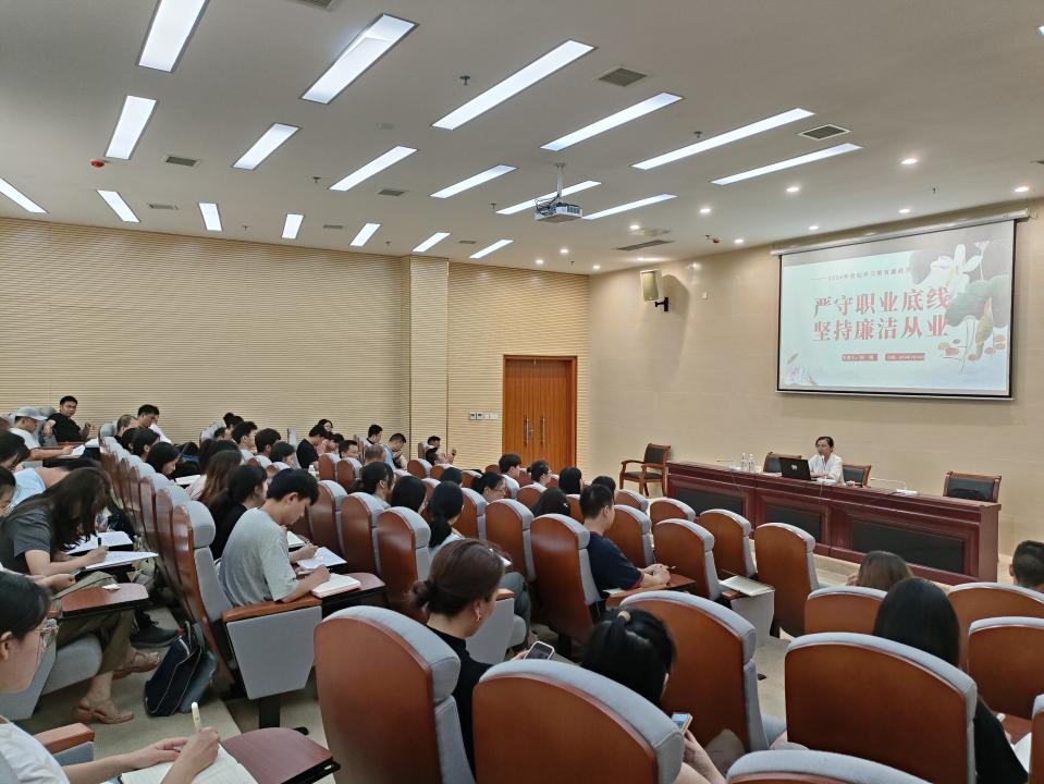 南校区行政楼第一报告厅为学院全体党员师生讲授题为《严守职业底线坚持廉洁从业》的廉政党课。