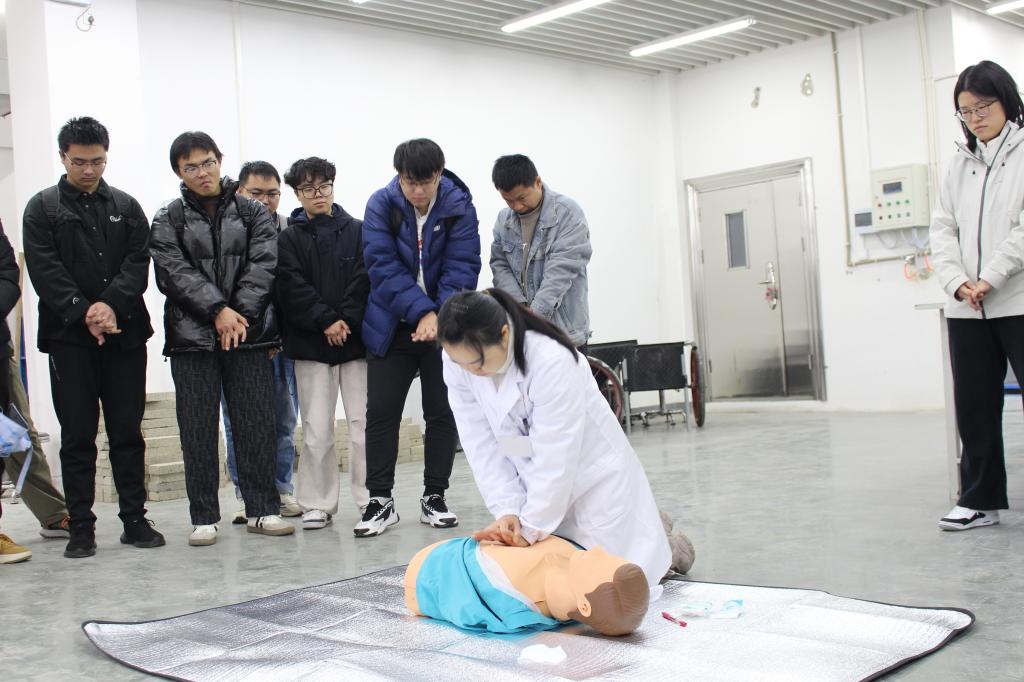 演练模拟因违规操作导致实验人员触电的突发情况。后勤处电工李师傅现场示范了紧急断电操作,强调使用绝缘手套或干木棍迅速切断电源的重要性。随后,校医院罗医生演示了心肺复苏(CPR)及自动体外除颤器(AED)的规范使用流程,帮助师生掌握触电急救的关键要领。通过该环节,参训师生进一步熟悉了触电事故的应急处置步骤与生命救援技能。
