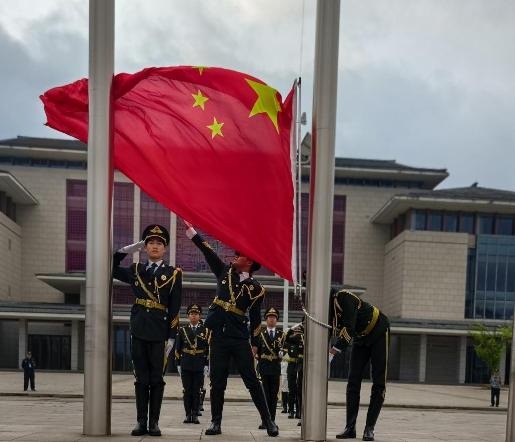 晨光熹微,广场静谧庄重。师生着装整齐、精神饱满,列队静候仪式开始。国旗护卫队身姿挺拔、目光坚毅,迈着铿锵步伐护送五星红旗走向升旗台,现场氛围庄严肃穆。